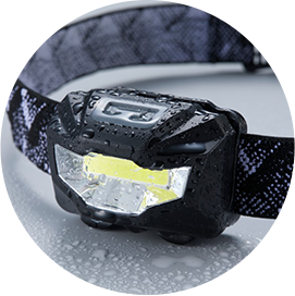 雨の中の作業にも役立つ防水ヘッドライト。停電時にも安心の乾電池式です。※電池別売(単4×3個)