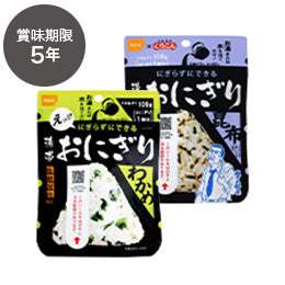 水かお湯で簡単調理、アレルギー物質28品目不使用の美味しい長期保存携帯おにぎり。味は昆布とわかめ。