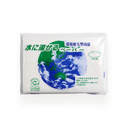 トイレ使用時にも使える水に流せるティッシュ。100%再生紙です。