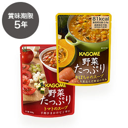 災害時に不足する野菜を美味しく摂れる⻑期保存スープ。味はトマトとかぼちゃの2種類。